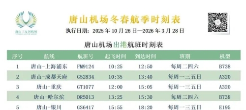 唐山机场自10月26日起执行冬春航季航班计划