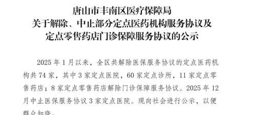 丰南区医保局关于解除、中止部分定点医药机构及定点零