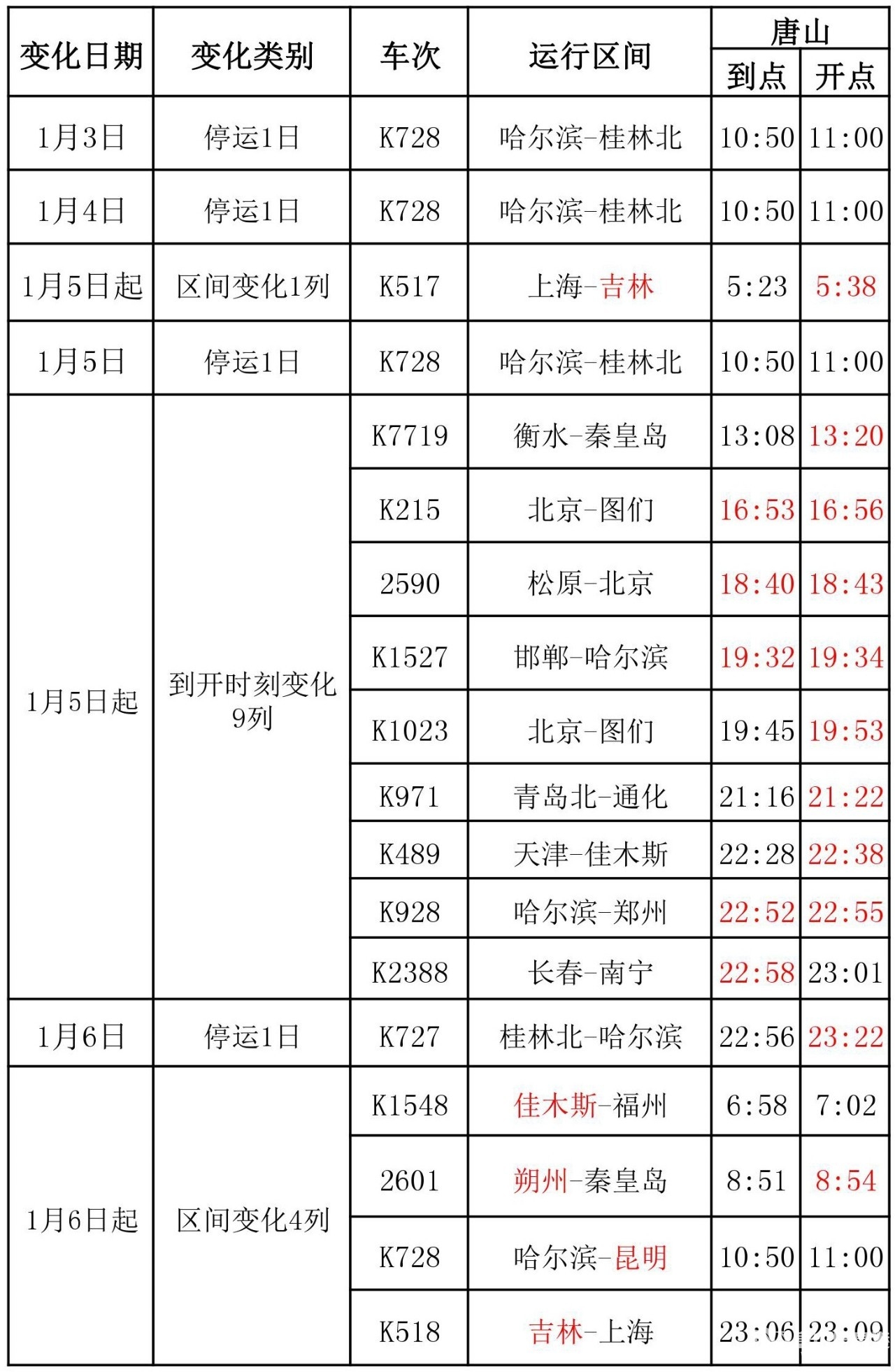 4.调整时间1.5对K7728次(秦皇岛-邯郸)自2016年12月30日起,唐山站到开时刻为22:37/47,(12月30日有两趟K7728次,新旧时刻各1列),2017年1月5日起执行新图时刻(停靠站时刻调整)。