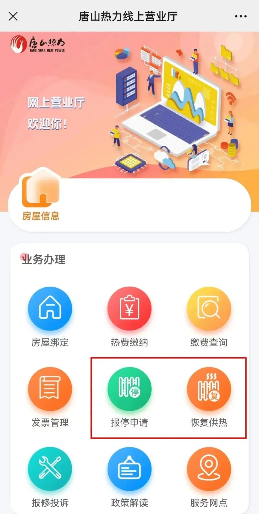 请关注“唐山热力官方平台”公众号→点击“暖心服务”