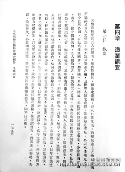《北宁铁路沿线经济调查报告》中对沿线的渔业生产也进行了详细的记述。本路沿线所涉八块区域,有三块区域在唐山境内,它们是:丰润县神堂、涧河口、黑沿子各口海面;滦县属南北堡、大庄河口等海面;乐亭县属大清河、老爷尖、石臼坨等口海面。沿海渔民生活景象“近年来每况愈下,入海捕捞,既感盗患,捕获后销市途中,又常遭匪扰,加以渔具资本重大,渔民平时食用,每向鱼店借贷,利息高出意外,渔期所获须优先售之鱼店,遇秤估价,惟鱼店之言是重,其能自置大号渔船者,于渔闲时,尚能赴芝罘、大连等处,贩运粮食、石料或装运商货,为一种副业以救济之,其船小无力者,惟有俟至次年渔期,入海捕捞,一年之中,温饱与否,悉凭诸天命,并无副业以救济之,若遇渔产丰收,则又任意挥霍,不知储蓄,至斥其余资,共谋渔具渔法之改良者,更属寥寥,现虽各区渐有渔业公曾之设,要皆为渔民谋福利是名,而收费自肥是实,同时船捐、渔税,重重压迫,致使不法渔民,铤而走险,善良守分之徒,亦无法谋生矣。”