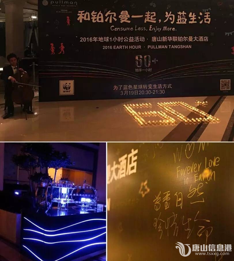 3月19日晚上8点半,唐山新华联铂尔曼大酒店关闭了外墙及绿化的所有灯光,内部所有营业区域也相应调暗灯光。在熄灯的一小时时间里,酒店大堂设立的签名墙和大提琴演奏吸引着酒店的宾客,他们在签名墙上写着对地球环保的建议,和酒店工作人员一起将点燃的蜡烛拼成60+,闪烁的烛光仿佛照亮了人们的心灵,在这一刻,保护地球,为蓝生活的信念如此坚定。与此同时,酒店为当天住店的客人提供免费的低碳环保茶歇,呼吁大家一小时只是开始,为了不见雾霾,重见蓝天,必须团结一心,为环保坚持。