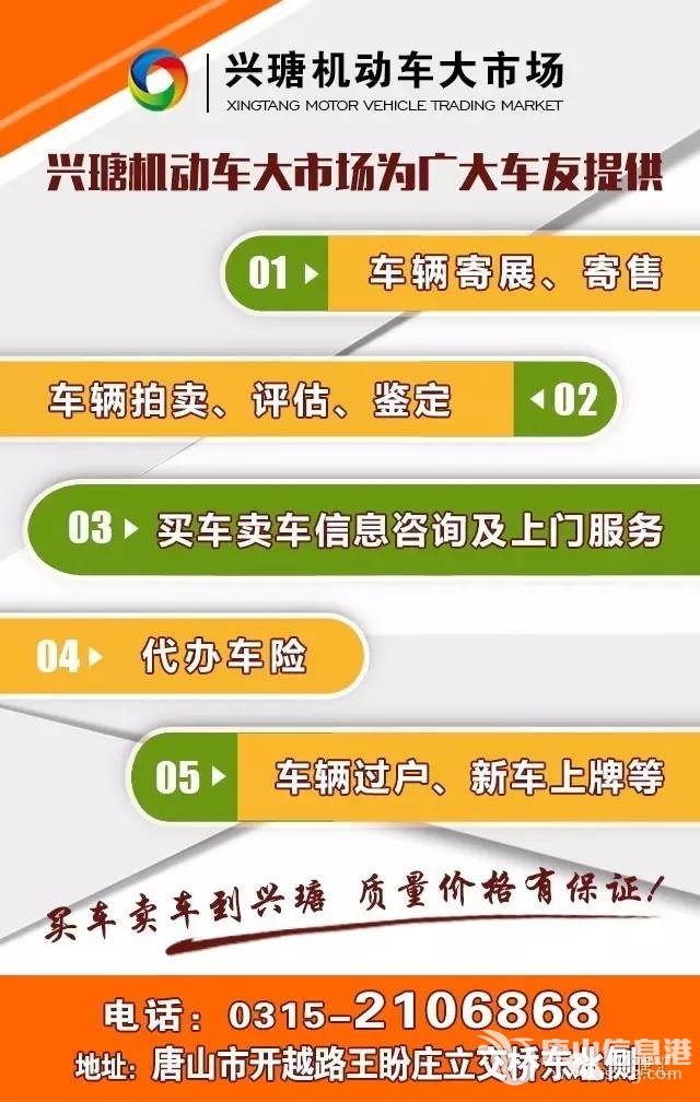 市车管所兴瑭服务站可办理新车上牌、车辆过户等手续。服务好,过户快,免手续费,车辆外检有问题现场协调解决!是您办理车辆过户上牌的不二之选!5月27日公车大排即将上演,详情长按下面“兴瑭汇”二维码关注!兴瑭机动车大市场地址开越路王盼庄立交桥东北侧公交路线:乘坐32路公交车,开越南路站下车,南行100米路东。还想看看更多时髦车型?兴瑭机动车大市场多家实力商家为你提供!