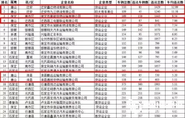 近日,河北省交管局根据数据分析,筛查出了全省今年1至5月份所属车辆在100辆以上,车均违法数前一百名的道路运输企业。迁安2家企业所属车辆,车均违法数列前两位。