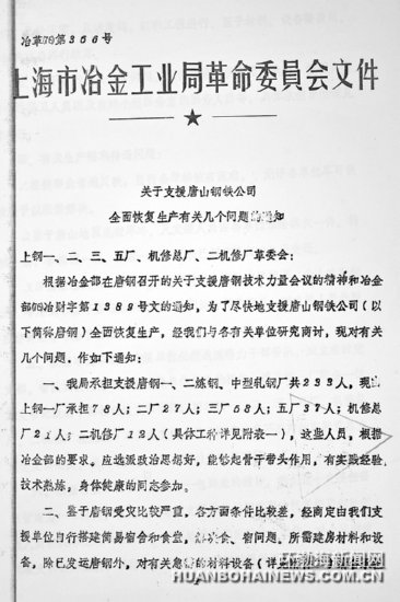1976年11月11日,上海冶金工业局革命委员会根据冶金部“对口支援一包到底”的要求精神,为了尽快地支援唐山钢铁公司(以下简称唐钢)全面恢复生产,与各有关单位研究商讨,做出如下决定: