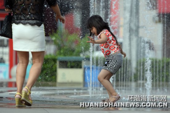 图为昨天下午,一位小朋友在百货大楼门前喷泉旁戏水享清凉。