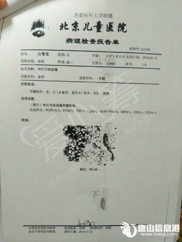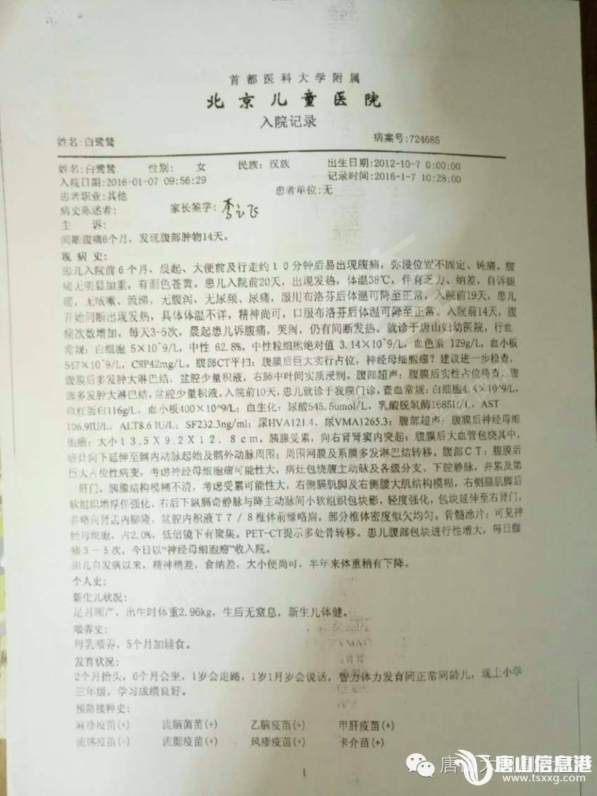 我们幸福地生活在2015年12月24被打破,当时鹭鸶才3岁2个多月,由于断续的发烧,加之腿疼,腹部疼痛,在唐山市妇幼医院被查出患有恶性肿瘤,当时医院的外科权威已经退休的周主任诊断为神经性母细胞瘤,建议我们到北京儿童医院去治疗,当时检查肿瘤总体大小14.3×16.2×8.8cm,此时我们就已经是晴天霹雳,心急如焚。当时马不停蹄到达北京儿童医院,辗转的挂到肿瘤外科王焕民主任的门诊,王主任告知他第二天要出国开会,要及时治疗,并且开了一系列的检查。结果出来后,秦主任门诊告知由于瘤体太大无法手术,需要去血二马主任那边接受化疗后才能手术,可正赶上快元旦,医院要求我们假期后,7号再来入院。无助的我们没办法只能煎熬等待着。