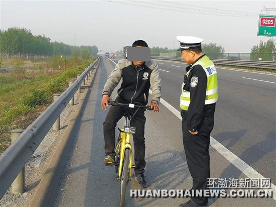 当天7时20分许,高速交警丰南大队民警巡逻至长深高速沈阳方向995公里处时,发现一男子骑着共享单车在高速公路路肩飞奔。民警立即将警车停在路边,将该男子拦下。经讯问,该男子称其是天津人,骑车前往廊坊,已经骑行了约40公里。当民警告知其正在向唐山方向行进时,该男子称唐山有一条小路能到廊坊。民警随即对其进行交通安全警示教育,告知其高速公路骑车的危险性,并让其将自行车搬过护栏,离开高速公路。