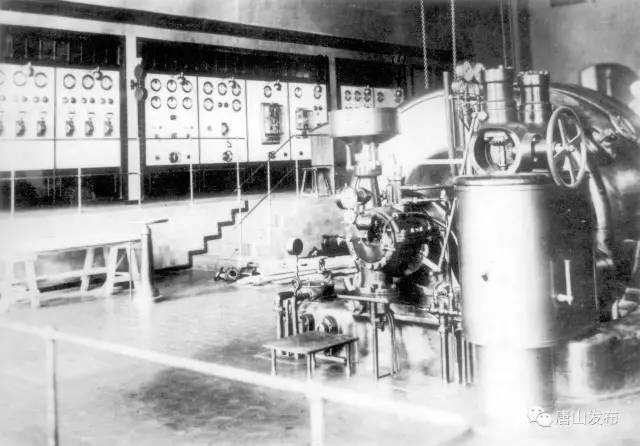 1914年周学熙等人集资兴建华记唐山电力厂,唐山公用电力事业从此发展起来。图为华记唐山电力厂汽轮发电机组