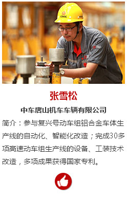 张雪松男,1973年2月出生,回族,中共党员,中车唐山机车车辆有限公司钳工。张雪松是中车唐山轨道客车有限责任公司铝合金厂钳工高级技师、数控装调维修工高级技师,参与了复兴号动车组铝合金车体生产线的自动化、智能化改造。他先后完成了30多项高速动车组生产线的设备、工装技术改造,修复数显伸缩尺、数控加工高速刀具500余次,多项成果获得国家专利。