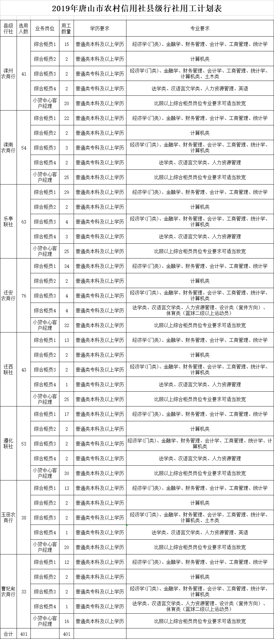 二、选用岗位及要求此次选用业务岗位劳务派遣工及小贷中心客户经理共计401人,其中:业务岗位劳务派遣工208人,小贷中心客户经理193人。选用人数及工作岗位和专业要求等详见《2019年唐山市农村信用社县级行社用工计划表》。