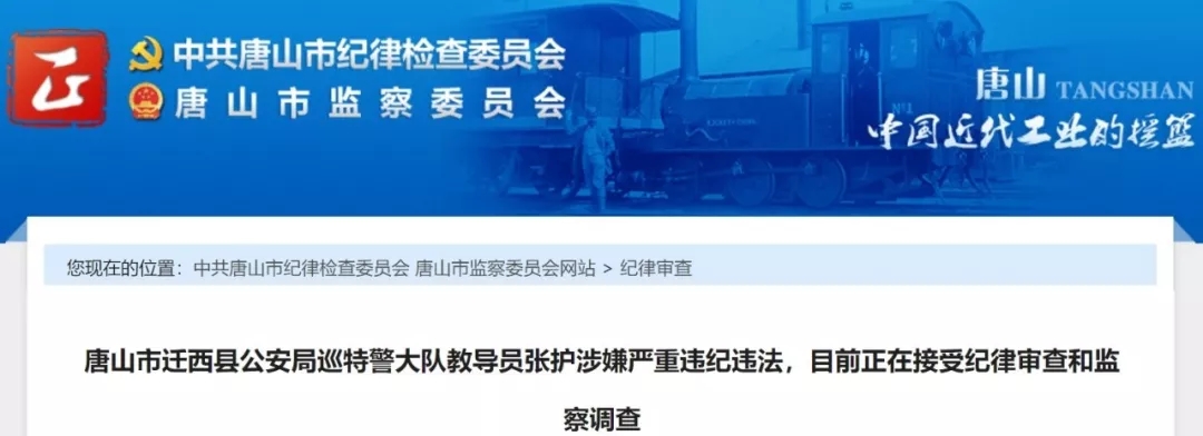 唐山市迁西县公安局巡特警大队教导员张护涉嫌严重违纪违法,目前正在接受纪律审查和监察调查。