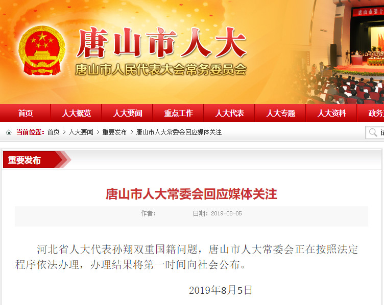 河北省人大代表孙翔双重国籍问题,唐山市人大常委会正在按照法定程序依法办理,办理结果将第一时间向社会公布。