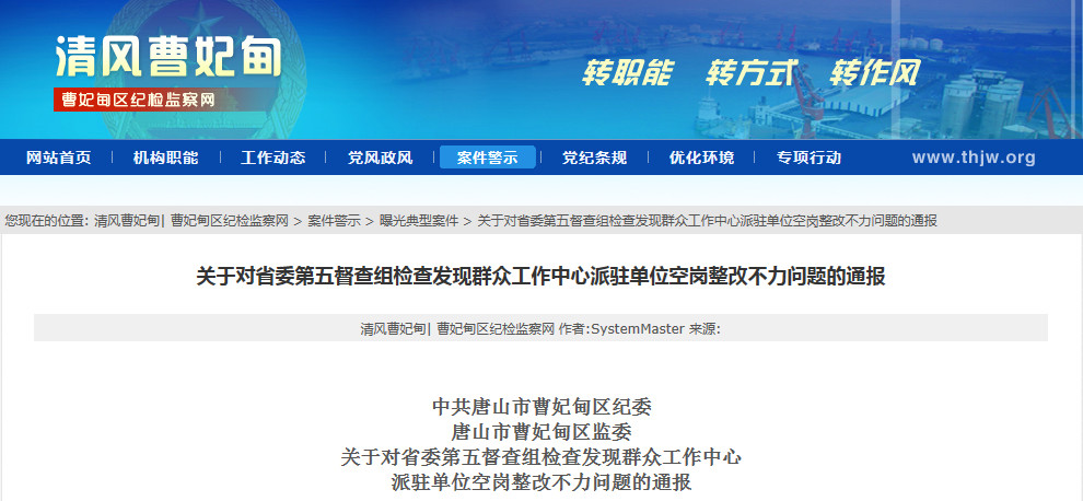9月26日上午,省委第五督查组到区信访局检查发现“群众工作中心空岗且考勤弄虚作假、曹妃甸区依然存在进京信访隐患、县级领导接访工作需进一步完善”等三个方面问题,并于9月29日交办。区信访局于10月11日上报整改情况。10月23日,省委第五督查组再次下达交办清单,指出曹妃甸区在办理重点问题整改工作中“存在思想不重视、敷衍整改的问题”,“与主题教育专项整治要求相悖”。省委第五督查组、市相关领导对我区提出了严肃批评。此事给我区带来不良影响,作为承担问题整改责任主体的区信访局及相关单位负有不可推卸的责任。为充分发挥“一案一警示”作用,现将有关情况通报如下。