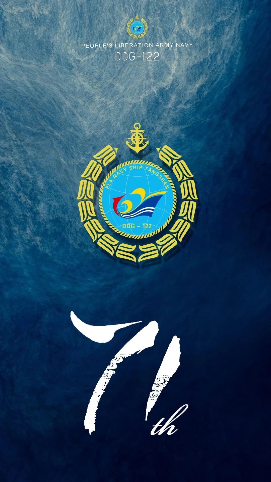 舰徽舰标设计在艺术表现上,外圈金色凤凰环抱地球,寓意守护世界和平的伟大使命;环绕地球的绳索紧密相连,拧成一股,寓意军民一心,团结一致;舵盘、锚代表在党中央的领导下,海军正确的方向和坚定的信念。整个标识构图张弛有力,线条曲张有度,将122、战舰、风帆、海浪、唐山首字母T等元素巧妙融为一体,勾勒出一艘风正帆满、剑指前方、所向披靡的出海战舰。标志中,舷号122的“1”形似利剑,呈威武之势,剑指四海,寓意“武”;阿拉伯数字“2”,艺术抽象处理如翅膀,如书卷,现飘逸之姿,寓意“文”。代表着中国海军文武兼备,文韬武略,忠勇双全,技高术精,是维护中国国家安全和世界和平的实力担当,更是中国海军走向深蓝的利剑先锋!