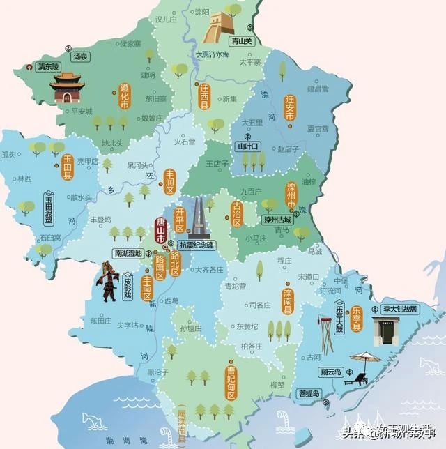 唐山市辖3个县级市 ( 迁安、遵化、滦州 ),4个县 ( 迁西、玉田、滦南、乐亭 ),7个区 ( 曹妃甸、路南、路北、开平、古冶、丰润、丰南 ),4个开发区 ( 海港经济开发区、高新技术产业开发区、芦台经济技术开发区、汉沽管理区 )。 唐山因唐太宗李世民东征高句丽驻跸而得名,素有“北方瓷都”之称。唐山是中国评剧的发源地,素有“冀东三支花”之称的皮影、评剧、乐亭大鼓,为国级非物质文化遗产。唐山大规模煤炭开采已有100多年。石油、天 然气从1956年开始普查,1964年开展石油地质勘察,已发现5个油气田。与煤炭伴生的煤层气储量也很大。此外,还有风能、太阳能、地热 能等多种资源。