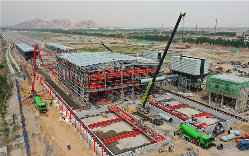 4月29日,工人在滦州市唐山东海钢铁集团有限公司“公转铁”专用线项目的翻车机房建设工地施工(无人机照片)。新华社记者 杨世尧 摄