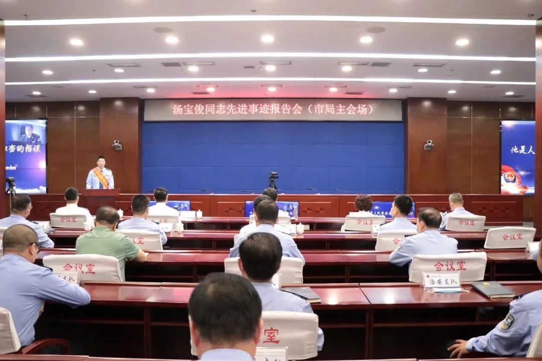 为追忆汤宝俊同志平凡而光荣的从警生涯,激励全警坚守初心使命,争创一流业绩,忠诚践行“对党忠诚、服务人民、执法公正、纪律严明”的总要求,5月18日,唐山市公安局举办汤宝俊同志先进事迹报告会。报告会上,汤宝俊生前同事,来自曹妃甸区局垦区治安分局的战友们,以及唐山劳动日报社高级记者孔祥华,分别以“他是人民警察忠诚担当的楷模”、“他是纪律严明清正廉洁的楷模”、“他是忠实践行人民警察庄严承诺的楷模”、“他是崇德修身无私奉献的楷模”、“他是新时代公安战线的一座英雄丰碑”为题,从不同角度讲述了汤宝俊生前一个个感人至深、催人奋进的故事。