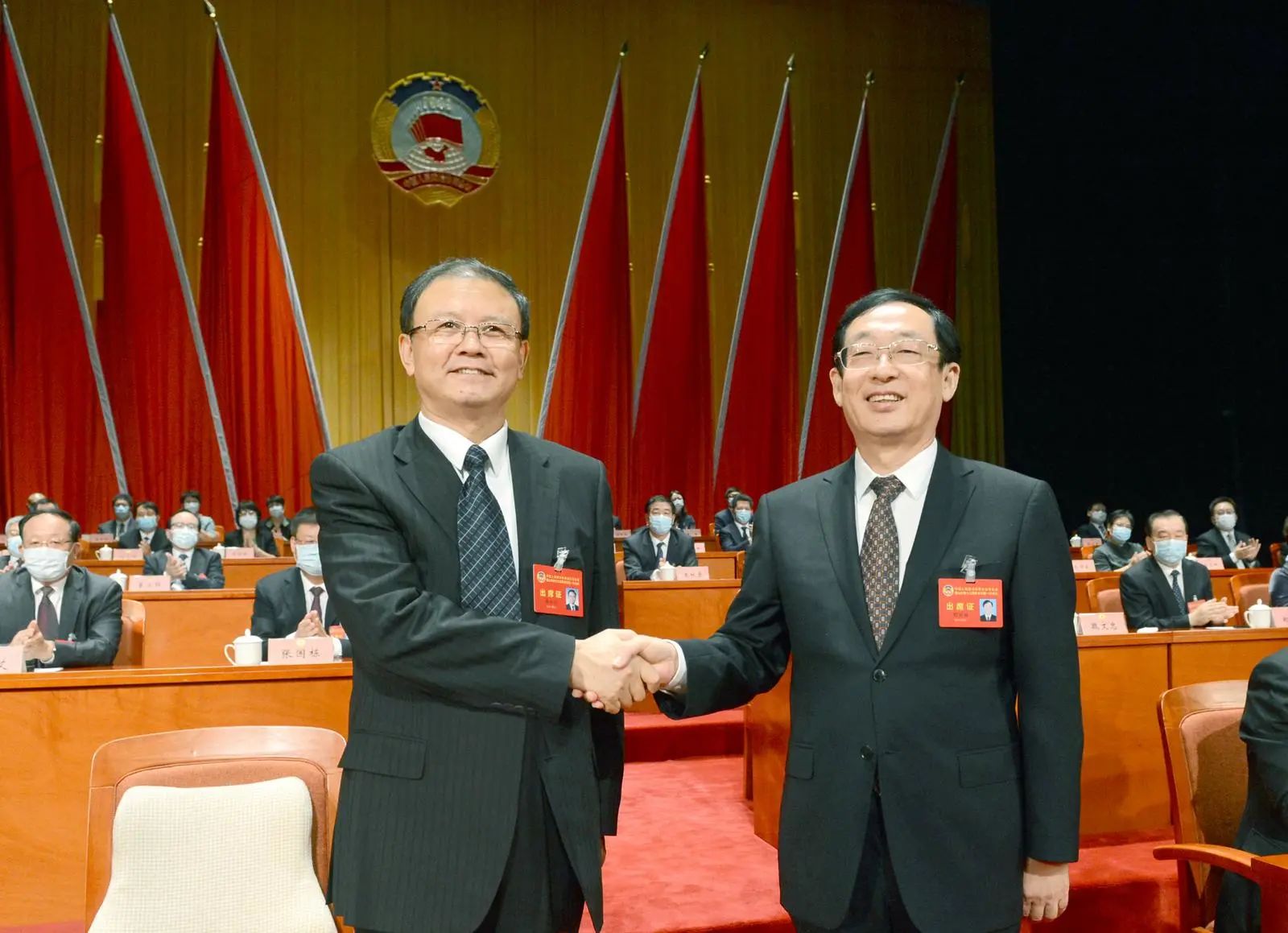 ▲省委常委、市委书记张古江与胡国辉握手,祝贺他当选市政协十三届委员会主席。记者 吕光宇 摄