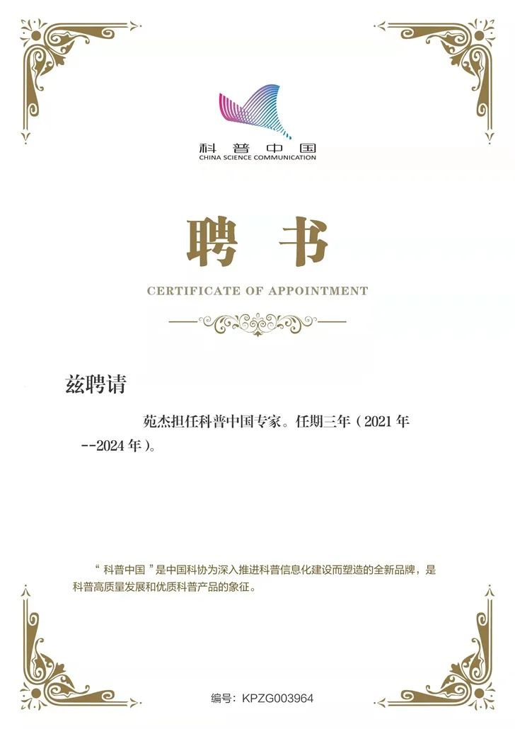 10月8日,唐山市科协常委、唐山市心理卫生协会理事长、华北理工大学冀唐学院院长苑杰教授收到一份特别的聘书,中国科协“科普中国”平台聘任苑杰教授担任科普中国专家。 苑杰教授 科普中国专家聘书