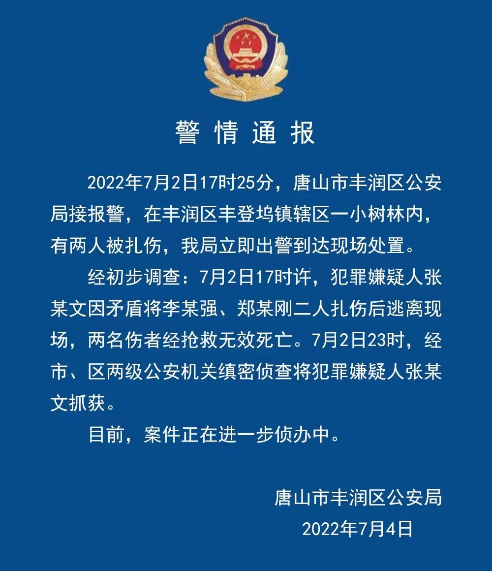 经初步调查∶7月2日17时许,犯罪嫌疑人张某文因矛盾将李某强、郑某刚二人扎伤后逃离现场,两名伤者经抢救无效死亡。7月2日23时,经市、区两级公安机关缜密侦查将犯罪嫌疑人张某文抓获。