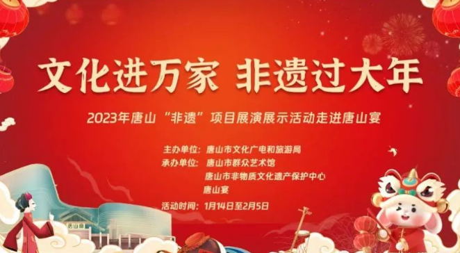 文化进万家 非遗过大年 (唐山宴站) 在唐山宴一层主舞台区,每天组织两场国家级非遗项目评剧、皮影、乐亭大鼓知名唱段进行展演活动。 在唐山宴一层餐饮区及二层祈福区进行剪纸、皮影雕刻、糖画、麻糖制作技艺、十四王爷烧鸡制作技艺、棋子烧饼制作技艺、遵化饹馇制作技艺、东陵皇家糕点制作技艺等非遗项目展示展销活动。 活动时间:2023年1月14日-2月5日 主办单位:唐山市文化广电和旅游局 文化进万家 非遗过大年 (爱琴海站) 在爱琴海商业区举办唐山皮影展演活动。展演剧目包括《鹤与龟》《武松打虎》《魔女梳妆》《小羊过桥》《狐狸与乌鸦》等。