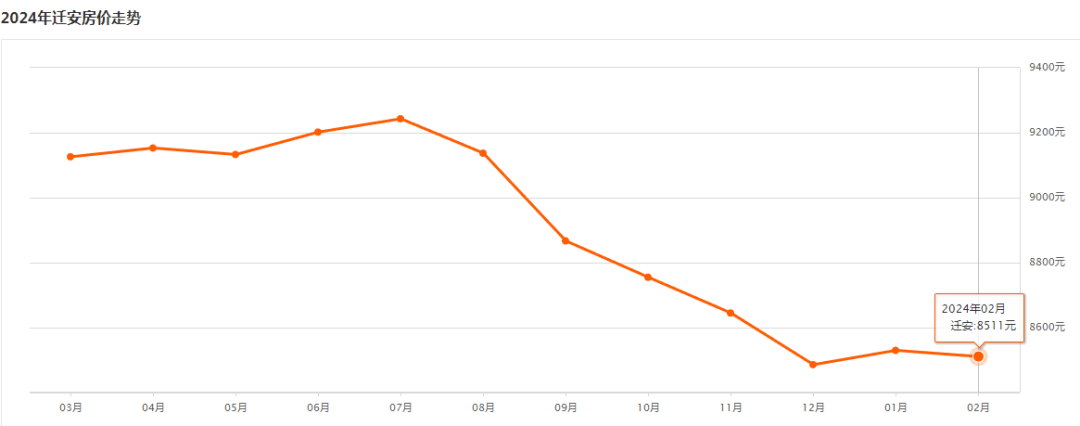 环比上月下跌 0.24% ↓迁安市 迁安2月二手房均价 8511 元/m²