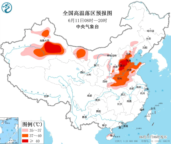 中央气象台6月11日06时继续发布高温橙色预警:预计6月11日白天,河北中南部和东北部、北京、天津、山东、河南、安徽北部、湖北北部、山西南部、内蒙古西部和东南部、新疆北疆盆地和南疆盆地、海南岛西北部等地有35℃以上高温天气,其中,河北中南部、北京东南部、天津、山东中北部、河南大部、内蒙古西北部、新疆南疆盆地东部等地最高气温37~39℃,河北中南部、新疆南疆盆地等地部分地区可达40℃以上。