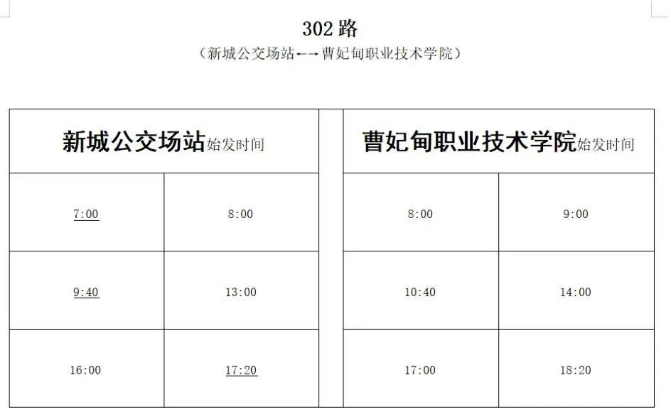 曹妃甸新城管理办公室 关于拟开通曹妃甸新城301路及302路公交线路的公告 为了优化曹妃甸新城公交运营网络,进一步满足广大市民的出行需求,不断提升城市公共交通服务功能,拟开通曹妃甸新城301路及302路两条公交线路。 一、301路 线路走向:科技南道—东海路—新港大道—学府路—富春路—通海路—玉湖道—凤栖路—新港大道—通海路—文慧道—中海路—渤海大道—行知路。 站点设置:河北科技学院、曹妃甸中心医院、曹妃甸职业技术学院东门、东港路北口、新港国际商业广场、景山学校、富春道学府路口、黄霓东路北口、丽景路北口、新城管委会、美和蓝湾、玉湖道西口、凤栖路南口、揽月湾景区西、橙霞家园、综合执法大队、国开实验学校、大学城文创街、华北理工大学南一门、华北理工大学、科技创新产业园、唐山海运学院、新城公交场站。 二、302路 线路走向:行知路—新港大道—东海路—滨湖道—景山路—新港大道—学府路—渤海大道—行知路。 站点设置:新城公交场站、东港路北口、祥宁道东口、曹妃甸城市馆、揽月湾、景山学校、新元道北口、华北理工大学西门、曹妃甸东站、华北理工大学南一门、华北理工大学、科技创新产业园、唐山海运学院、曹妃甸职业技术学院。 该两条公交线路拟于2024年7月1日起试运营,具体班次运行计划详见301路及302路公交运行时刻表。同时,我们也将在后续的公交运营实践中,广泛听取群众优质建议,持续不断优化调整,以满足更多群众出行需求。 特此公告。 曹妃甸新城管理办公室 2024年6月30日 301路及302路公交运行时刻表