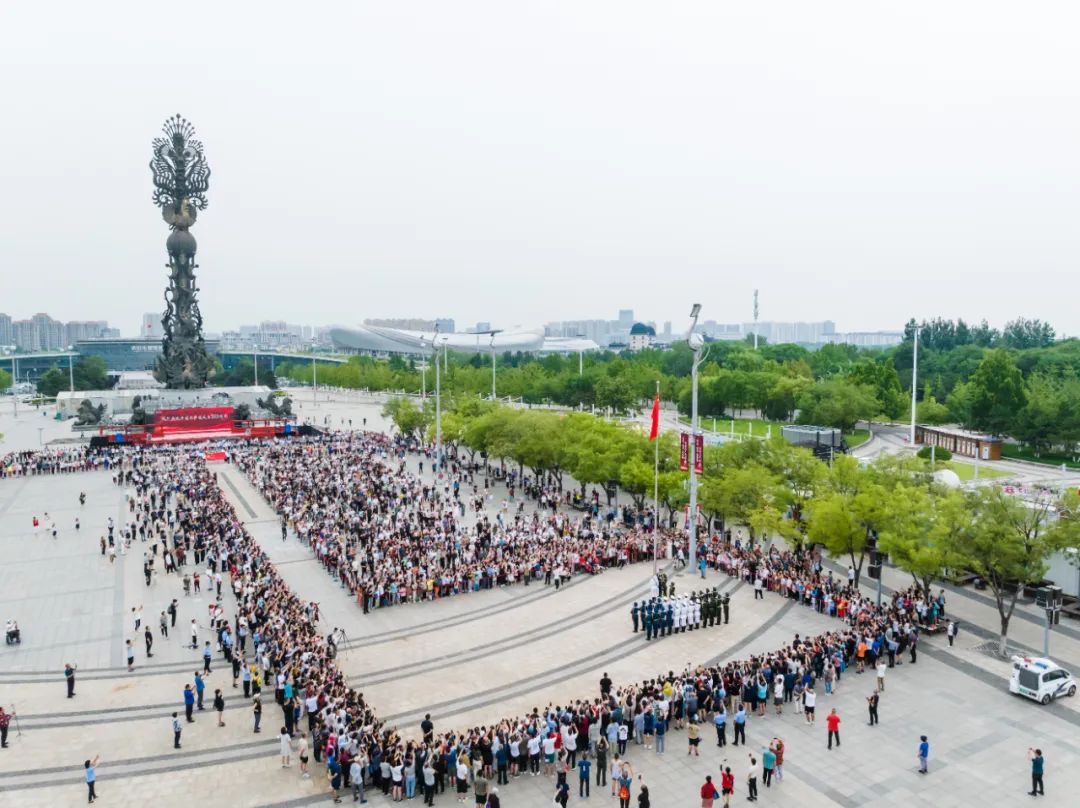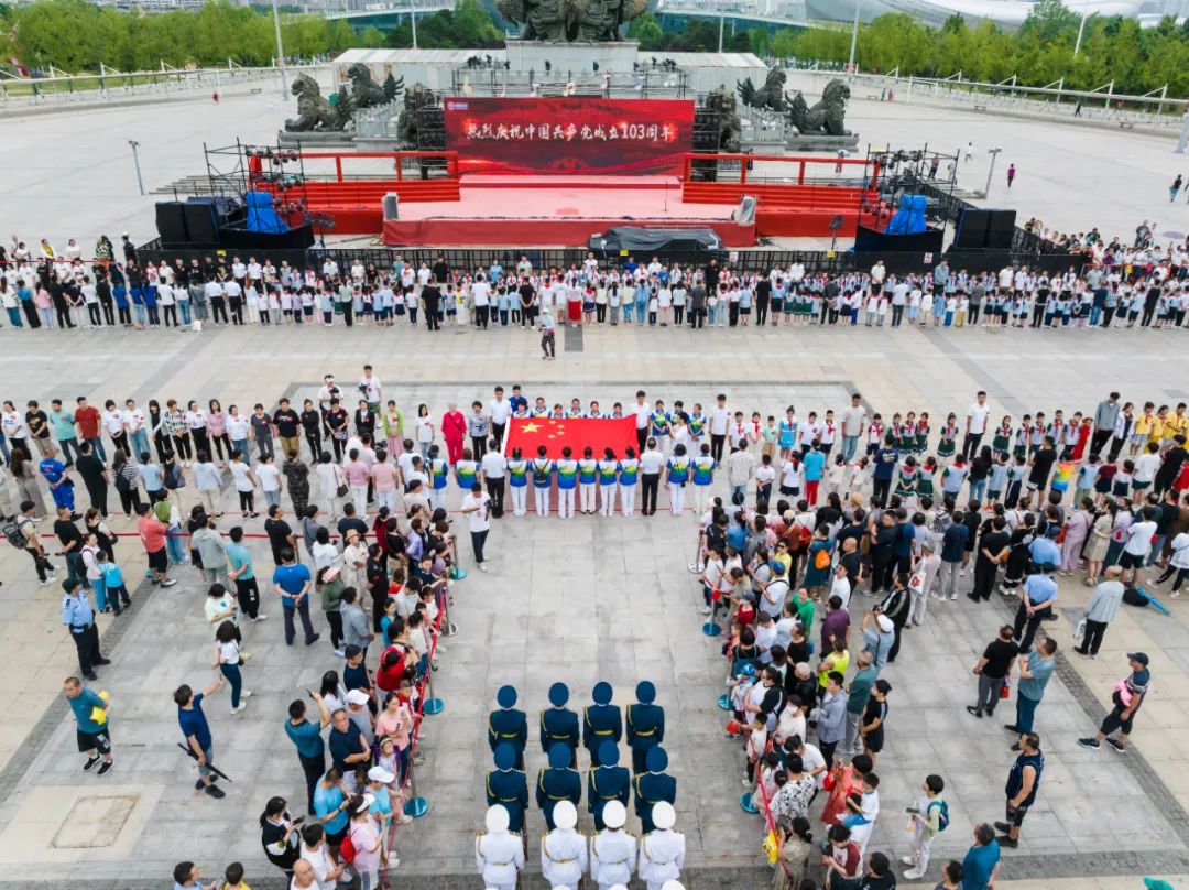 “七一”期间,唐山投资控股集团、唐山文旅集团匠心推出“庆七一”系列文旅惠民活动,通过主题升旗仪式、管弦乐系列演出、无人机表演、光影水舞秀、红色经典电影放映等形式多样的文旅惠民活动,全面回顾党的光辉历程,讴歌党的伟大成就,弘扬伟大建党精神,庆祝中国共产党成立103周年。 7月1日上午,“激扬家国情怀 凝聚奋斗力量”庆祝中国共产党成立103周年主题升旗仪式在唐山南湖旅游景区丹凤朝阳广场举行。来自集团各单位的员工、广大市民及各地游客1万余人齐聚于此,共同见证五星红旗冉冉升起的庄严时刻,为党献上生日祝福。 相约国旗下,传递赤子情。清晨,丹凤朝阳广场上人潮涌动,聚满等待参加升旗仪式的人群。上午7时30分,升旗仪式正式开始。在《没有共产党就没有新中国》的激昂歌声中,来自全国各地、各行各业、不同年龄段的500余名传旗手依次将鲜艳的五星红旗缓缓传递,从银发老人到追梦青年,再到朝气少年,人们用手手相传的方式,表达着爱党爱国的炽热情感,用心心相印的行动,传递出英雄城市、英雄人民建功新时代的无限豪情。 28名仪仗队护旗手英姿飒爽,目光坚定,迈着坚实而雄健的步伐护送着鲜艳的五星红旗走向旗杆处。现场群众则分列两侧,注目凝视,铿锵有力的脚步声激荡着现场每个人的爱党爱国之心。 伴随着雄壮的《义勇军进行曲》,鲜艳的五星红旗在晨光中冉冉升起。现场群众面向国旗肃立,行注目礼,高唱国歌,共同沉浸于这庄严的时刻。这一刻,每一张脸庞都写满了骄傲与自豪。当五星红旗升至旗杆顶端,人们奋力挥舞起手中的小红旗,欢呼声、掌声此起彼伏、经久不息,表达着对祖国、对伟大的中国共产党的真挚祝福。“我早上4点多就从天津出发了,感觉参加这次活动非常有意义,为唐山这座英雄的城市点赞!”专程从天津赶来的传旗手李先生说道。