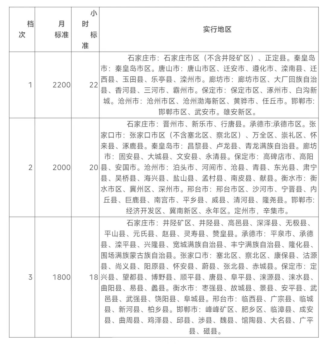 最新的全国各地区最低工资标准 河北省月最低工资标准 第一档:2200元 第二档:2000元 第三档:1800元 河北省小时最低工资标准 第一档:22元 第二档:20元 第三档:18元 图源:河北人社网