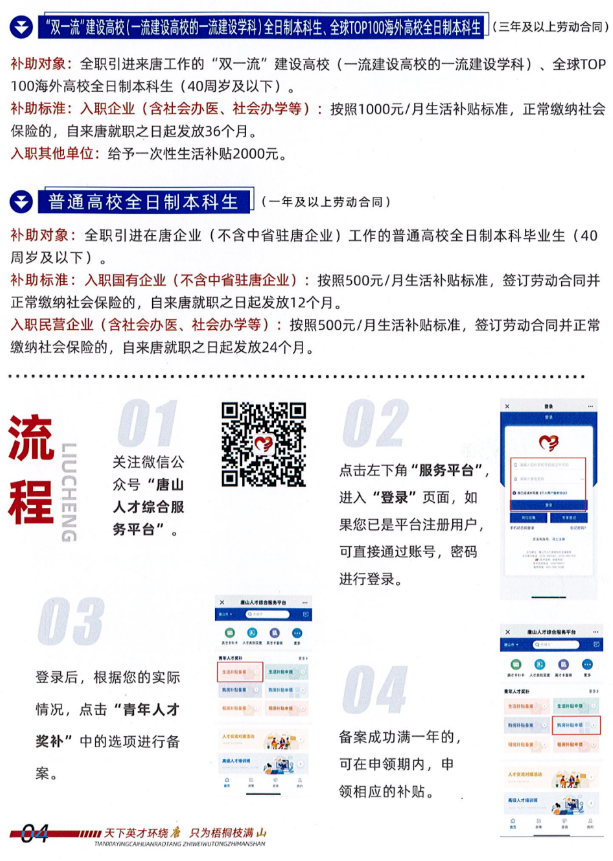 为深入落实市委、市政府《关于深入实施凤凰英才计划为加快实现“三个努力建成”“三个走在前列”目标提供人才支撑的意见》(唐字〔2024〕2号)文件精神,支持青年人才为推动我市高质量发展挑大梁、当主角,不断吸引各类青年人才来唐创新创业,制定如下细则。 一、奖补范围 (一)全职引进或培养的在唐工作博士研究生(50周岁及以下)。 (二)全职引进来唐工作的硕士研究生(45周岁及以下)。 (三)全职引进来唐工作的“双一流”建设高校(一流建设高校的一流建设学科)、全球TOP100海外高校全日制本科生(40周岁及以下)。 (四)全职引进在唐企业(不含中省驻唐企业)工作的普通高校全日制本科毕业生(40周岁及以下)。 (五)在唐工作期间,新取得硕士研究生学历学位(45周岁及以下)的在职人员。 二、奖补标准 (一)博士研究生(五年及以上劳动合同) 1.生活补贴:按照3000元/月标准,正常缴纳社会保险的,自在唐就职之日起发放60个月。 2.购房补贴:在唐就职并购买市域内自用商品住房,且正常缴纳社会保险的,一次性给予30万元购房补贴(不限首套,此政策只享受一次)。 购房补贴和生活补贴二者只能选择一项。 (二)硕士研究生(五年及以上劳动合同) 1.入职企业(含社会办医、社会办学等): ①生活补贴:按照1500元/月标准,正常缴纳社会保险的,自来唐就职之日起发放60个月。 ②购房补贴:来唐就职并购买市域内自用商品住房,且正常缴纳社会保险的,一次性给予10万元购房补贴(不限首套,此政策只享受一次)。 购房补贴和生活补贴二者只能选择一项。 2.入职其他单位: ①生活补贴:给予一次性生活补贴5000元。 ②购房补贴:来唐就职并购买市域内自用商品住房,且正常缴纳社会保险的,一次性给予10万元购房补贴(不限首套,此政策只享受一次)。 购房补贴和生活补贴二者只能选择一项。 3.在唐工作期间: 新取得硕士研究生学历学位(同时具有毕业证和学位证)的,给予一次性补贴5000元。 (三)“双一流”建设高校(一流建设高校的一流建设学科)全日制本科生、全球TOP100海外高校全日制本科生(三年及以上劳动合同) 1.入职企业(含社会办医、社会办学等):按照1000元/月生活补贴标准,正常缴纳社会保险的,自来唐就职之日起发放36个月。 2.入职其他单位:给予一次性生活补贴2000元。 (四)普通高校全日制本科生(一年及以上劳动合同) 1.入职国有企业(不含中省驻唐企业):按照500元/月生活补贴标准,签订劳动合同并正常缴纳社会保险的,自来唐就职之日起发放12个月。 2.入职民营企业(含社会办医、社会办学等):按照500元/月生活补贴标准,签订劳动合同并正常缴纳社会保险的,自来唐就职之日起发放24个月。 三、申报和审核程序 (一)注册。单位通过“唐山人才综合服务平台”PC端(https://rcpc.hfclass.com)进行注册。个人通过“唐山人才综合服务平台”微信公众号进行注册。 (二)备案。申领人登陆“唐山人才综合服务平台”线上提交相关材料原件进行备案,所需提交材料如下: 1.申领人身份证、毕业证、学位证、教育部学历证书电子注册备案表;留学回国毕业生需教育部出具的《国外学历学位认证书》; 2.劳动(聘用)合同(博硕5年及以上、本科3年及以上)、社会保险人员参保证明; 3.购房补贴还需提交:商品房买卖合同(或房地产转让合同)、购房发票。 (三)申领。备案成功满一年后,通过“唐山人才综合服务平台”微信公众号线上提交相关材料原件进行补贴申领,所需提交材料如下: 1.申领人身份证、毕业证、学位证、教育部学历证书电子注册备案表;留学回国毕业生需教育部出具的《国外学历学位认证书》; 2.劳动(聘用)合同(博硕5年及以上、本科3年及以上)、社会保险人员参保证明、银行卡工资流水记录; 3.购房补贴还需提交: ①新房、二手房:商品房买卖合同(或房地产转让合同)、购房发票、契税、不动产权证、不动产登记资料查询结果证明、户籍首页及本人页。 ②期房:商品房买卖合同、购房发票、商品房合同备案查询信息。 (四)初审。唐山市人才综合服务平台窗口或各县区人才服务平台窗口对青年人才上报材料进行初审,审核通过后报主任复审。 (五)复审。对初审通过人员进行复审,审定无异议的,报同级财政部门核定奖补资金。 (六)公示。对申领补贴人员在“唐山人才综合服务平台”或用人单位进行公示(七天),接受社会监督。 (七)发放。公示无异议后,根据市财政局《关于市级人才发展专项资金财政保障有关事宜的通知》(唐财社〔2022〕88号)要求,提请同级财政部门拨付资金,按照每年一、三季度集中申领,每满半年发放一次的原则,拨付至申领人个人银行帐户。 (八)特殊情况。对于条件认定不清或存在异议的情况,按照程序提交市委人才工作领导小组办公室研究审定。 四、监督管理 (一)市委人才工作领导小组办公室负责统筹指导青年人才奖补政策的兑现;人力资源和社会保障部门负责编制年度预算、组织申报、资格审核、奖补资金发放,监督指导各地各部门开展相关工作;市县两级财政部门负责资金保障和资金拨付等工作。 (二)申领生活补贴的青年人才在合同期内变更单位性质的,以变更时间为节点,按就高不就低的原则不重复发放;申领生活(购房)补贴的青年人才在合同期内解除劳动合同离唐的,由用人单位及时向市人才交流中心备案,终止补贴发放。 (三)每年市人才交流中心对全市