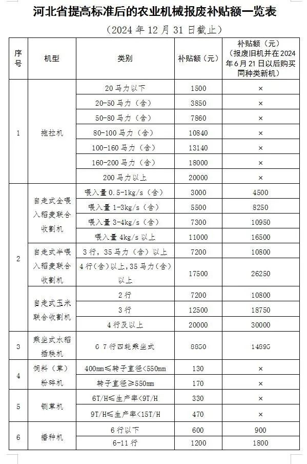 2024年唐山市农机报废政策告知卡 2024年,国家、省、市出台了新的农机报废的优惠政策,对13种农机具给予报废补贴,较往年新增了6种农机种类,补贴标准大幅提高,新政策执行期限为2024年12月31日止,我市集中报废期限为2024年10-11月,补贴资金有限,机会难得、先到先得,希望广大农民和农业经营组织抢抓机遇,应报尽报。