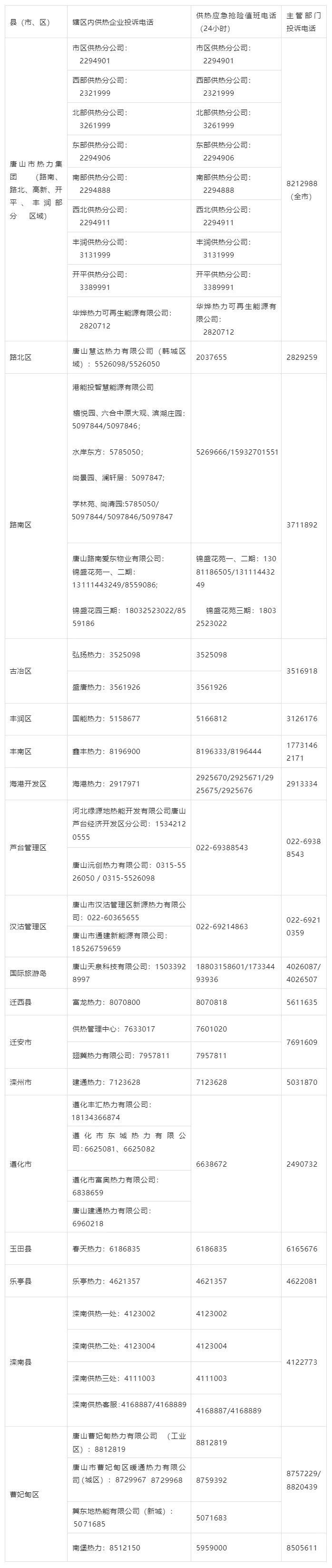 唐山各县(市、区)供热应急投诉渠道