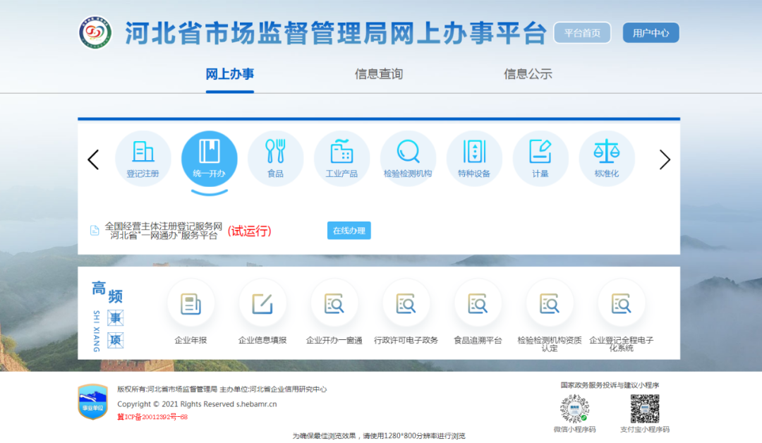 关于整合调整“网上办事—登记注册”业务系统的通告 尊敬的经营主体: 为进一步优化工作流程,提升服务效率,更好地满足经营主体需求,河北省市场监督管理局对“网上办事—登记注册”业务系统整合调整,全面上线“全国经营主体注册登记服务网河北省‘一网通办’服务平台”(简称“冀e注”),现就有关事项通告如下: 一、平台介绍 新平台涵盖开办、变更、注销、迁移各业务类型,同时整合经营主体名称自主申报、登记注册全程电子化、多证合一、外商投资企业信息报告、企业开办“一窗通”、港资电子公证文书流转等多个业务系统,适用于各类经营主体办理开办、变更、注销、迁移等业务,提升业务办理效率。 平台网址:http://s.hebamr.cn/bsdt/