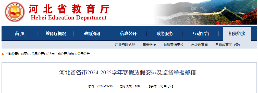 12月30日,中国河北网站发布了《河北省各市2024-2025学年寒假放假安排及监督举报邮箱》,其中,唐山中小学寒假放假及开学时间为↓↓↓