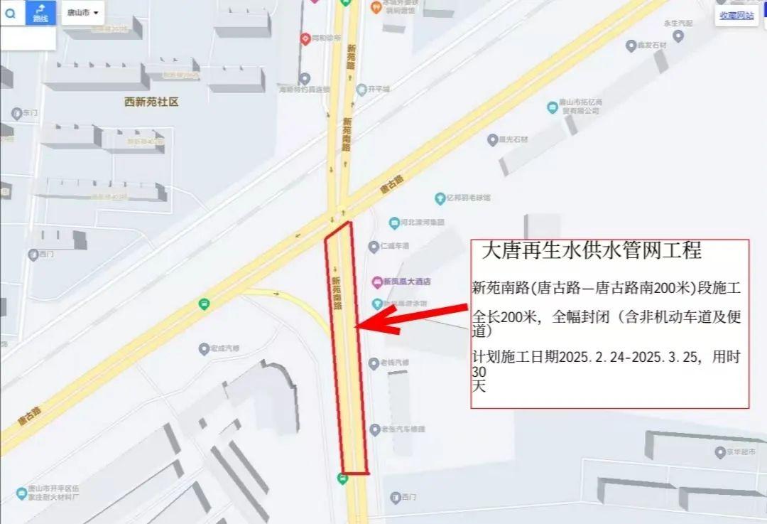 因供水管网改造工程需要,新苑南路与唐古路交叉口南侧至华岐生活区将全幅断交施工,日期为:2025年2月24日-2025年3月25日,施工期间道路封闭,需通行车辆可绕行开越路、唐古路。