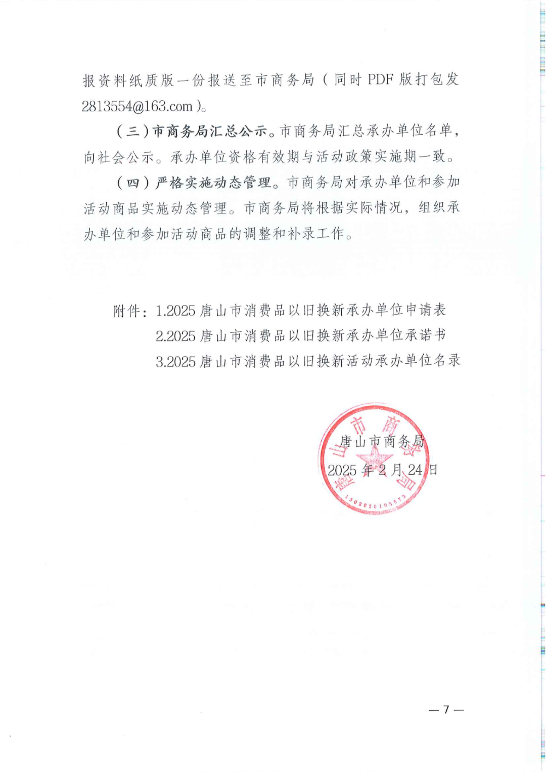 为贯彻落实党中央、国务院决策部署,按照省发改委、省财政厅《关于2025年加力扩围推动大规模设备更新和消费品以旧换新实施方案》要求及省商务厅工作安排,唐山市商务局2月24日印发了《关于征集2025年唐山市家电家装电动自行车以旧换新活动承办单位的通知》(下称通知),旨在全市范围内组织开展家电家装电动自行车以旧换新补贴活动。现将此《通知》转发你们,请意向单位按照《通知》要求准备申报材料,于3月3日17:30前将纸质版申报材料送至商促局516室,电子版U盘拷贝。逾期送达不予受理,视为放弃征集资格。