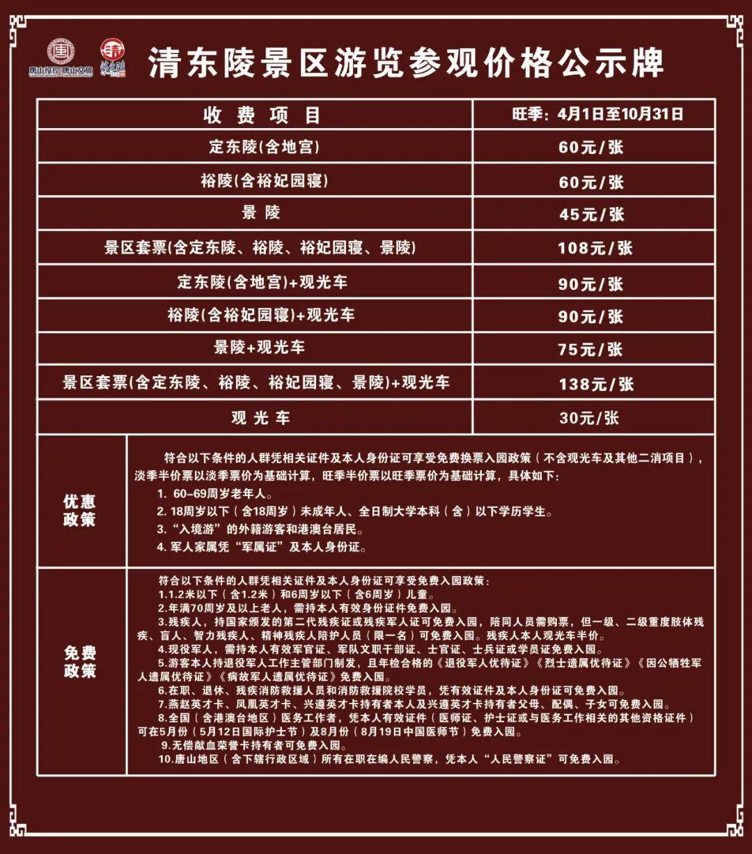 关于清东陵景区实施旺季运营管理的通告 尊敬的游客朋友们: 随着季节的变化和景区实际运营情况的调整,为了给您提供更加优质的游览体验,清东陵景区现将2025年旺季期间的门票价格及相关事宜通告如下: 一、旺季时间 4月1日-10月31日。 二、旺季票价