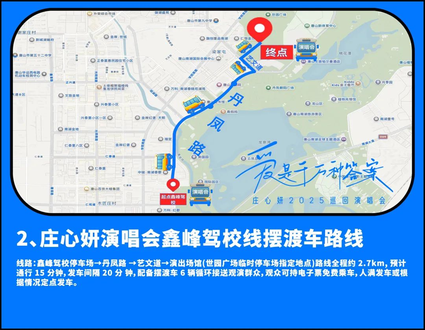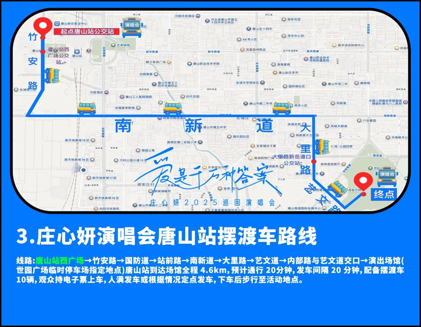 2025年4月19日晚,庄心妍巡回演唱会(唐山站)将在唐山新体育中心体育场举办,由于演出当天通行人员较多,场馆周边交通压力过大,周边可用停车位较少,建议观众使用公共交通工具到达场馆。
