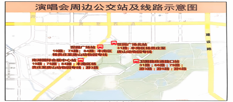 预计车流量较大路段摆渡车本场演出设有摆渡车,观众可在停车场附近停靠点乘坐前往场馆。演出结束后,可乘坐摆渡车返回。(摆渡车发车时间为14:00至23:00,观众凭票有序上车)